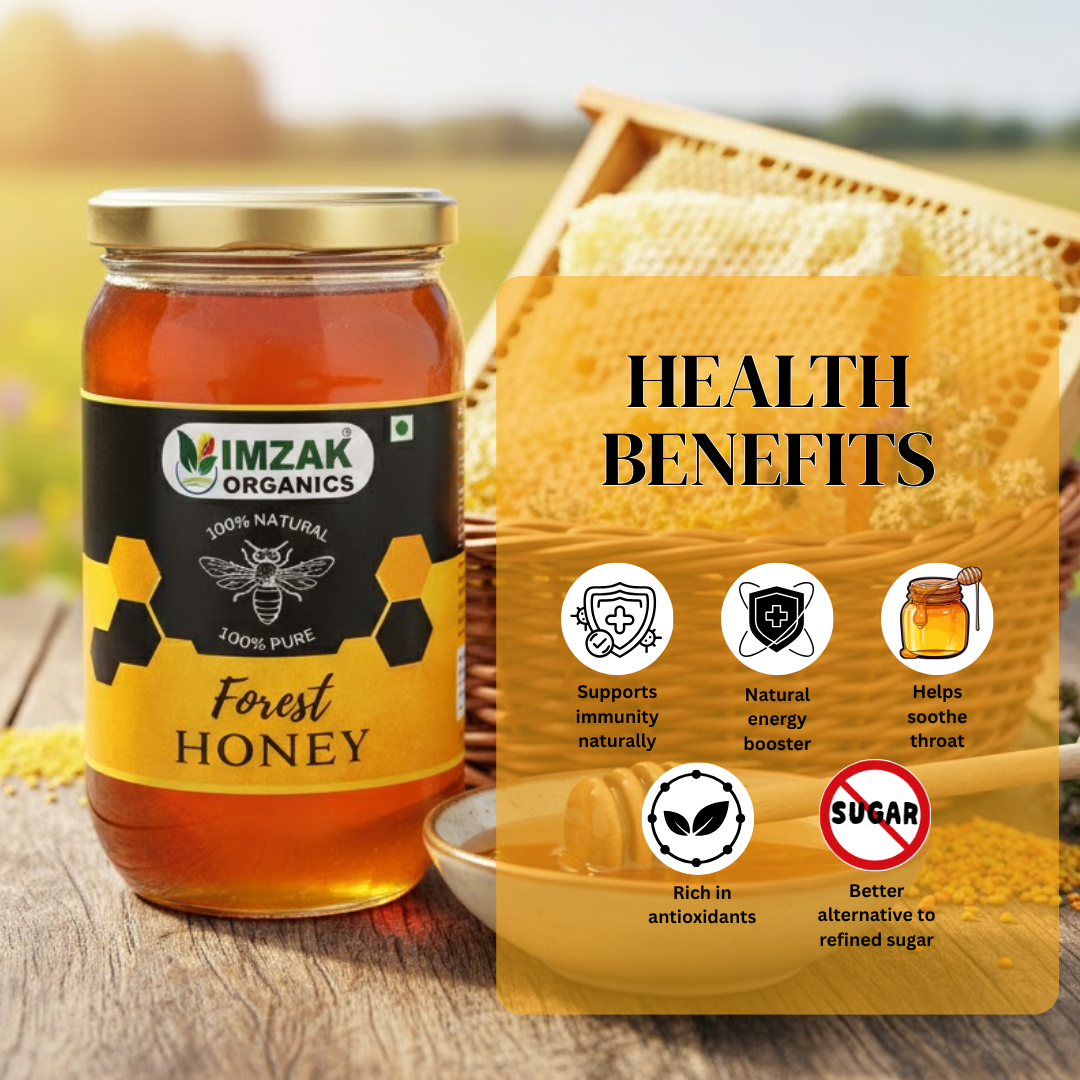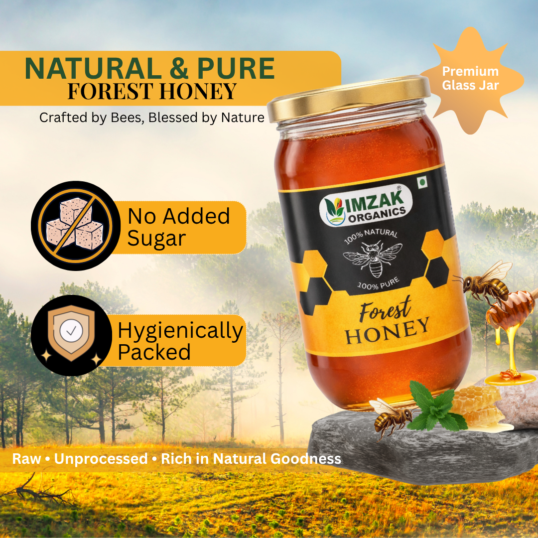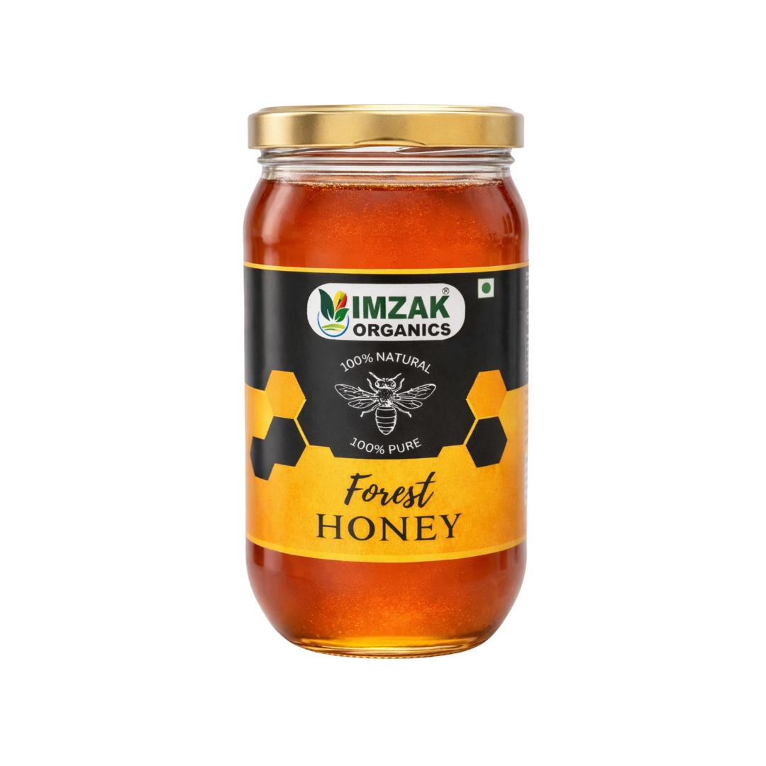 IMZAK Organics Forest Honey is a premium quality honey sourced from the nectar of wildflowers in the forest. Our honey is 100% pure and organic, free from any additives or preservatives, and carefully harvested to preserve its natural richness.