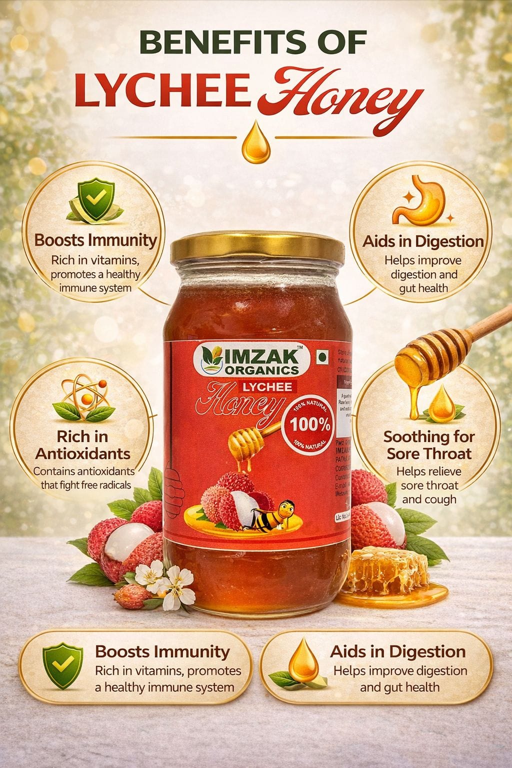 Beyond its irresistible taste, our organic lychee honey is a powerhouse of everyday wellness: